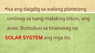 - Ang enerhiya na nagmumula sa araw ang nagpapainit sa solar system at nagbibigay buhay sa lahat ng mga organismo.